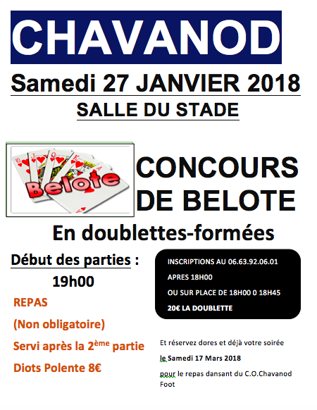 Le C.O.Chavanod est fier de vous annoncé son fameux concours de belotte 2018 !