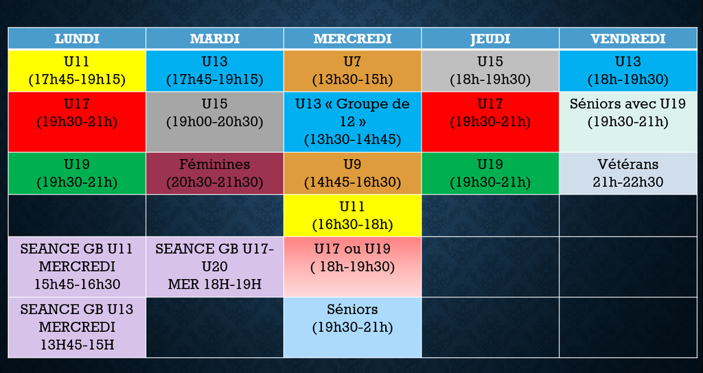 Planning et horaires entraînements saison 2018-2019