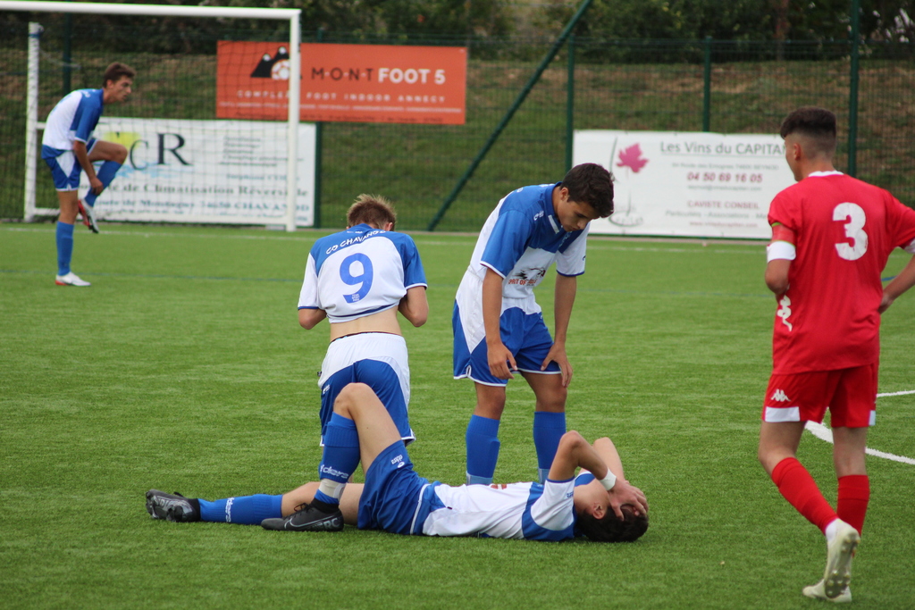 Les Bleus n’y étaient plus en 2 e mi temps : trop laxistes et sûrement stressés, ils ne réussissaient plus à inquiéter les visiteurs. A force de subir, les Bleus se faisaient punir. 60e minute, sur un coup franc lointain tiré dans la boite, personne ne touchait le cuir ce qui surpris Léo Carrez qui touchait le ballon sur un arrêt réflexe mais ne pouvait empêcher le but. 2-1 plus que logique pour le FC Nivolet. 65e minute c’est encore et toujours Léo Carrez qui dégageait le ballon en corner d’une superbe parade. Sur le corner qui suivait, le ballon était tiré raz du sol au premier poteau et l’attaquant adverse effectuais une sublime Madjer et venait crucifier les Bleus. 3-1 pour le FC Nivolet.