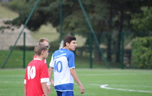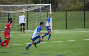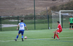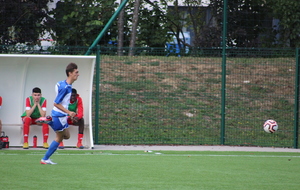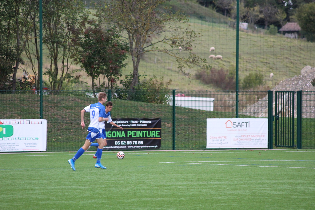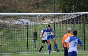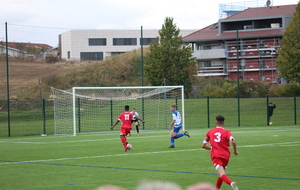Le but n’a pas eu l’effet d'un coup de massue pour nos bleus qui continuaient à pousser, en dominant petit à petit les débats tant sur le plan offensif que défensif et ils allaient se retrouver récompensés de leurs efforts. A la 40e minute, suite à un coup-franc mal ressorti, Paul Bray passait le ballon à Théo Gaudron, resté aux devant. Ce dernier effectuait un beau contrôle orienté pour se retrouver face au gardien et gagner son face à face avec plein de sang froid. Les bleus méritaient leur égalisation et ils ne comptaient pas s’arrêter là. A la 43e, c’est Adam Augelo qui venait faire trembler le FC Nivolet sur un coup franc lointain de plus de 30 mètres, la balle prenait la direction des filets mais le gardien, vigilant, effectuait une parade incroyable pour empêcher les locaux de mener à la marque à la pause.