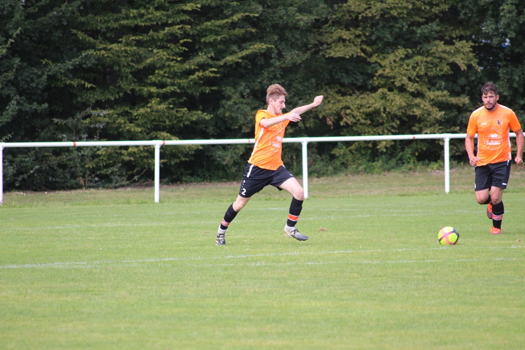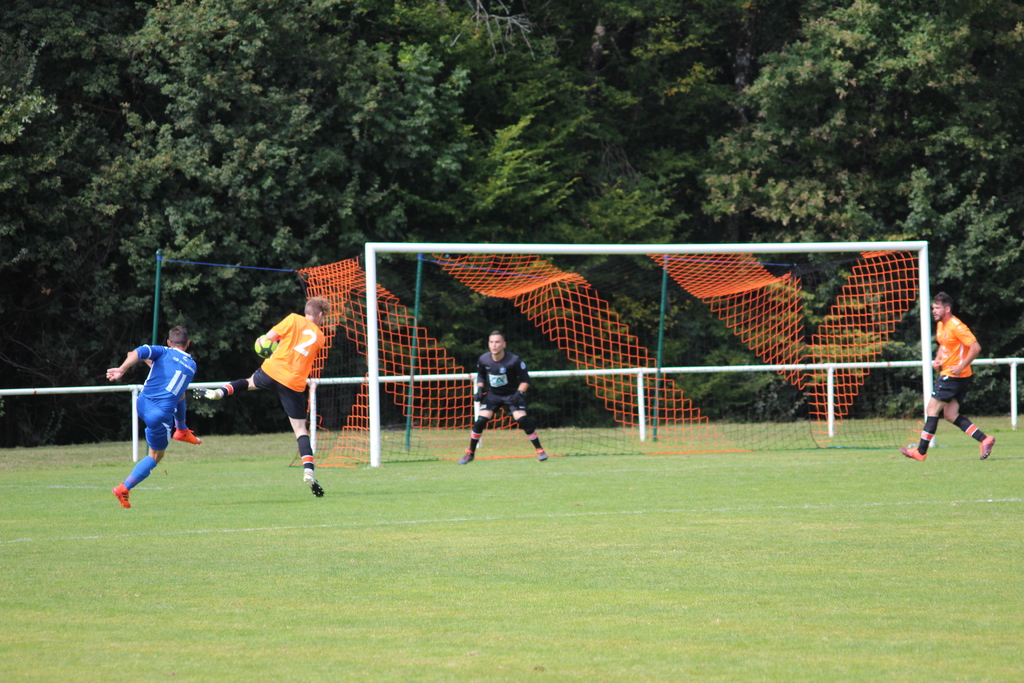23eminute, sur une passe « anodine » et plein axe, la défense bleue se troue littéralement et laisse l’attaquant orange se présenter face à Vincent POLLIENS. Heureusement, l’attaquant adverse dévisse totalement sa frappe qui s’envole loin au dessus de la cage ! Alerte qui commençait à sonner le début de la révolte seminoise.